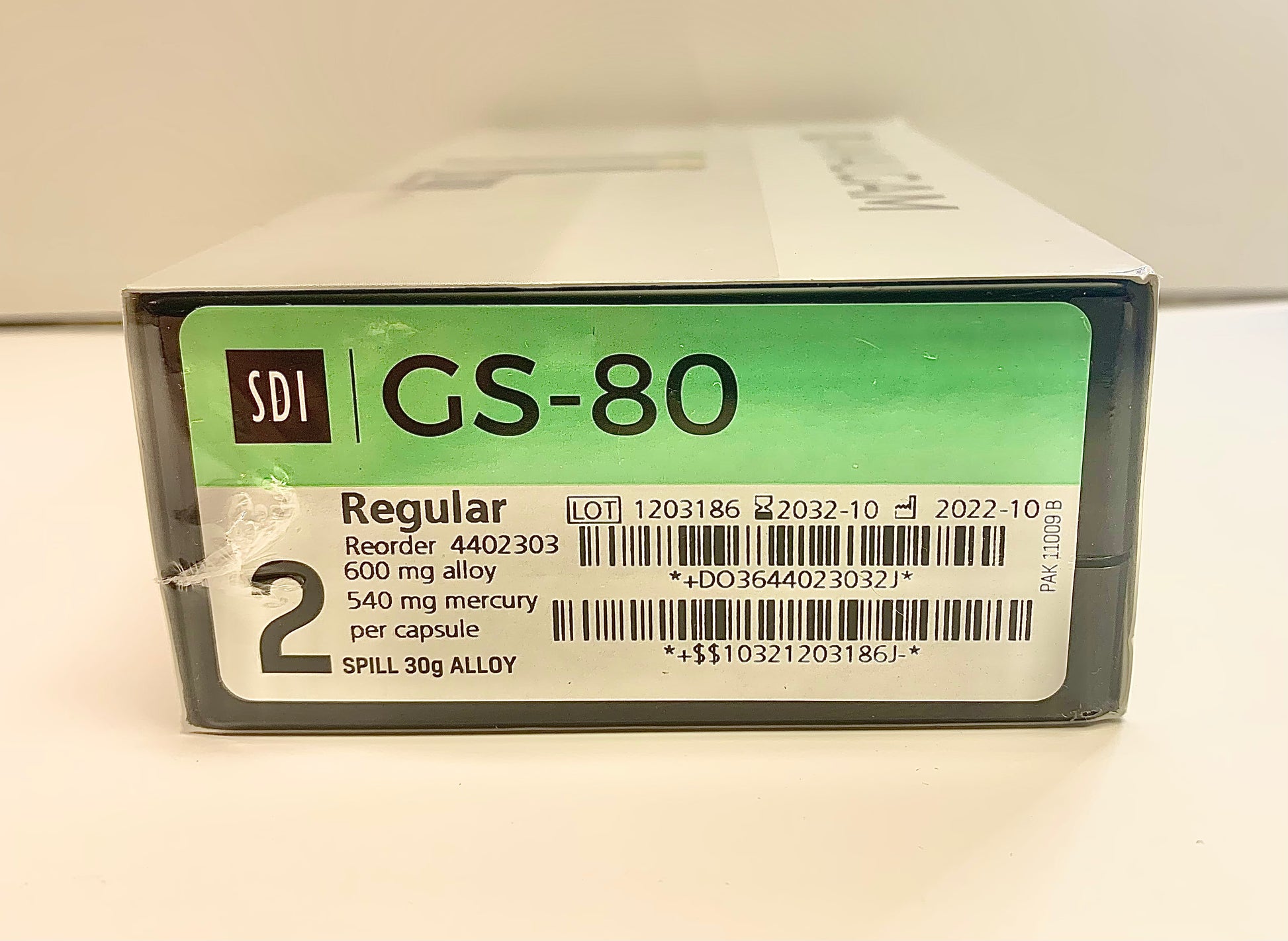 SDI is the manufacturer. GS-80 2 spill or 600 mg per capsule. 50 capsules per box. Manufacturer reorder number 4402303. Regular set. Spherical and lathe cut.
