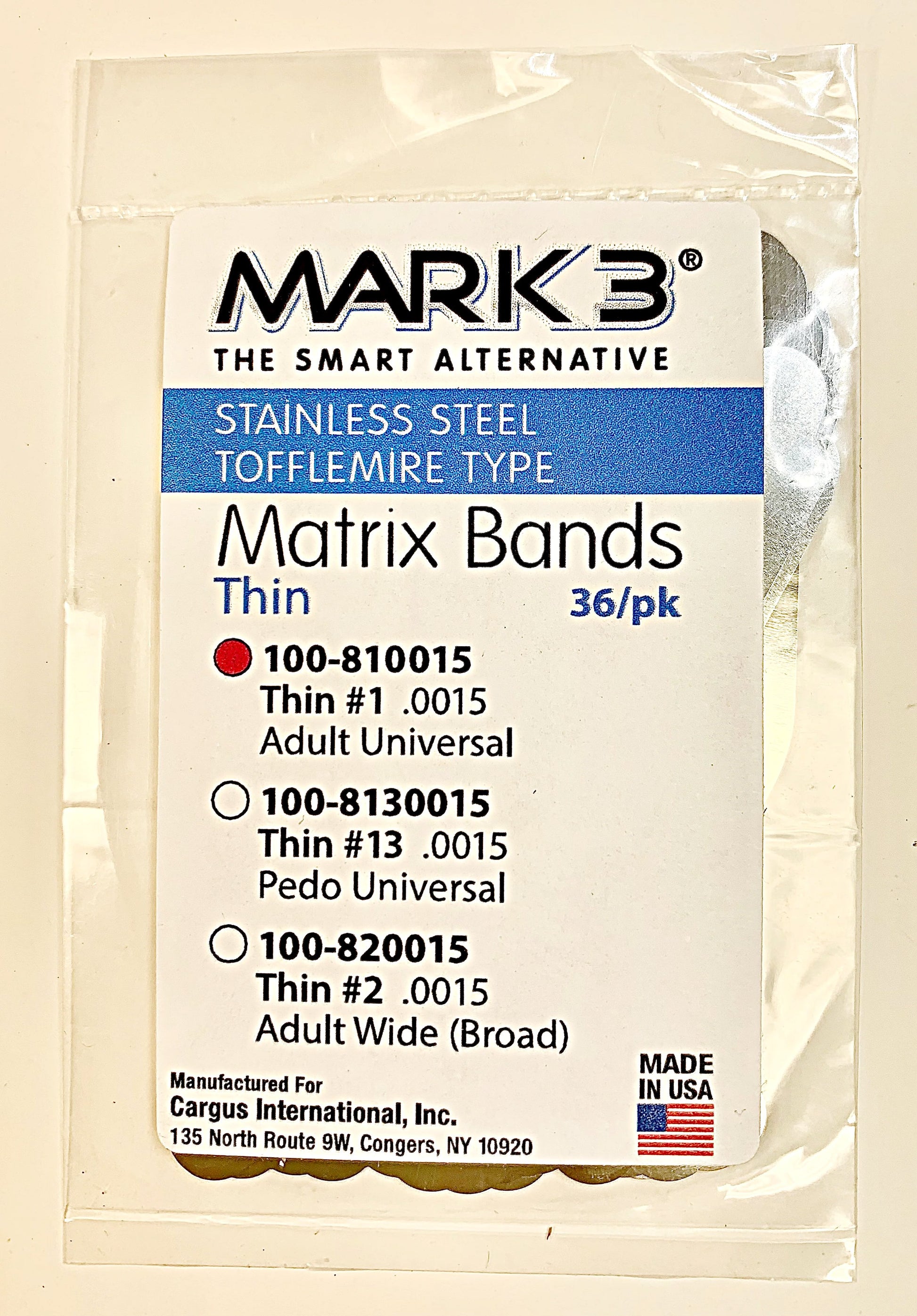 Tofflemire band #1 Adult universal Mark3, 36/bag 0.0015 thickness (thin). Surgical grade stainless steel. Smooth edges for increased patient comfort and less gingival trauma. Flexible. Made in the USA. Click here for the Mark3 info tofflemire band info sheet