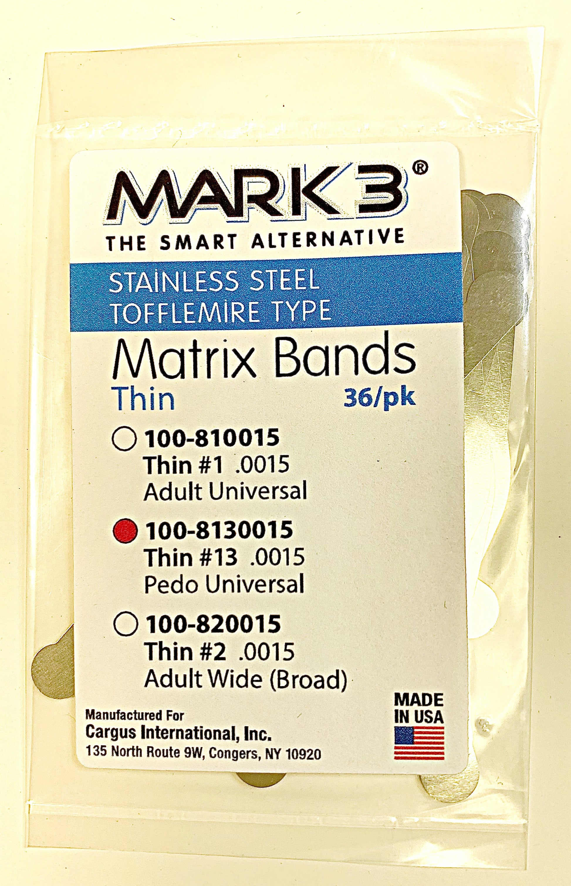 Tofflemire band #13 Pedo universal Mark3, 36/pack, 0.0015 thickness (thin). Surgical grade stainless steel. Smooth edges for increased patient comfort and decreased gingival trauma. Flexible. Made in the USA. Click here for the Mark3 tofflemire band info sheet.