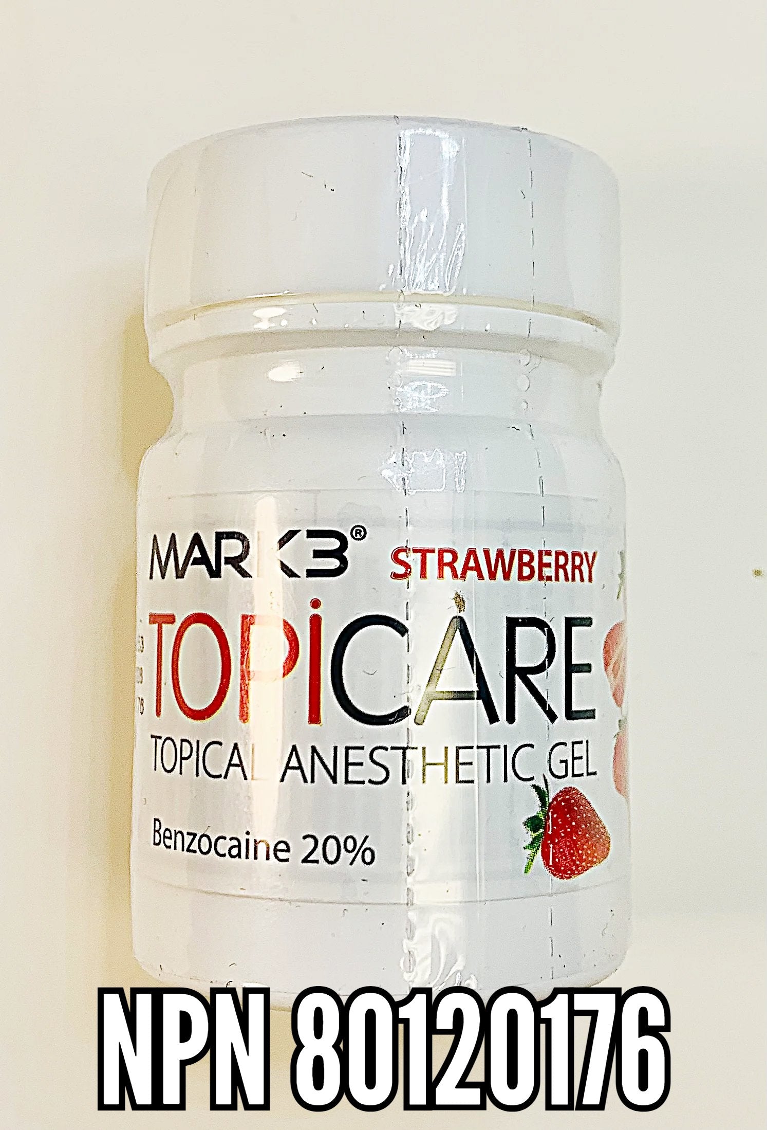 TOPICARE Mark3 Topical Anesthetic Gel 1oz. STRAWBERRY flavor. NPN 80120176 (can be sold in Canada). Benzocaine 20%. Smooth gel consistency which is easy to apply. Stays where placed; is not gritty or runny. No bitter aftertaste for your patients.
