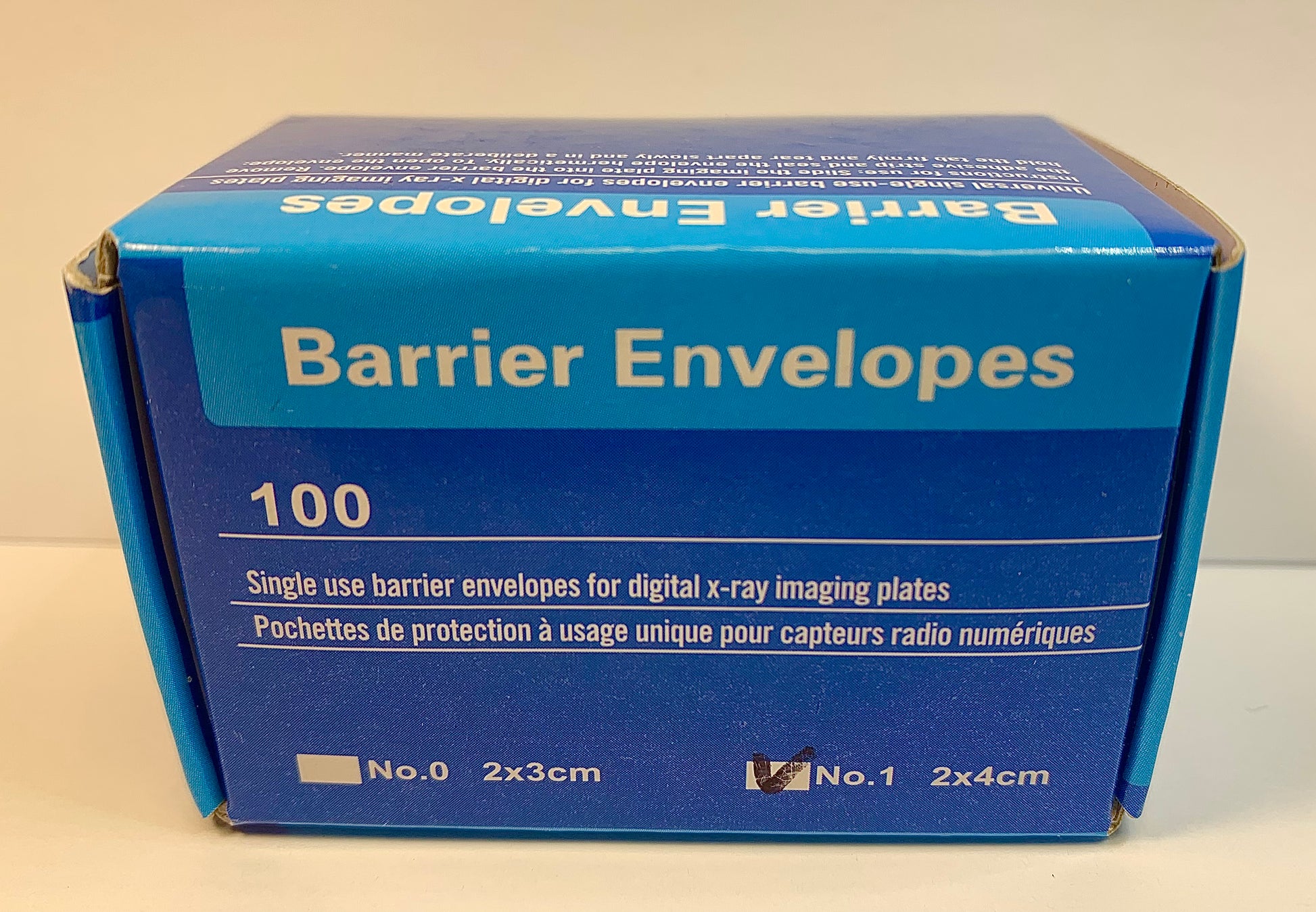 X-ray barrier envelopes 100/box size# 1. About 2 x 4 cm. Box of 100 Single use barrier envelopes for digital x-ray imaging plates. Generic brand.